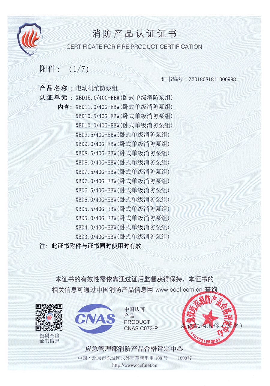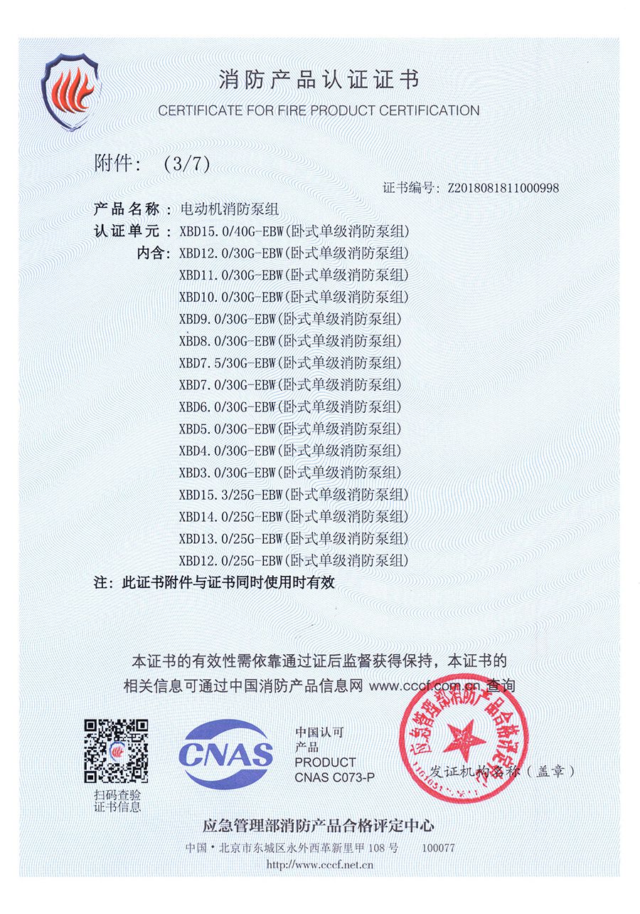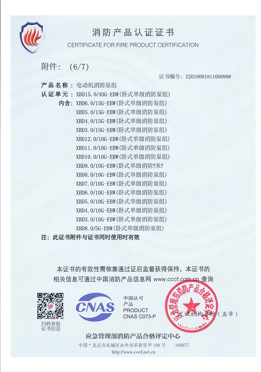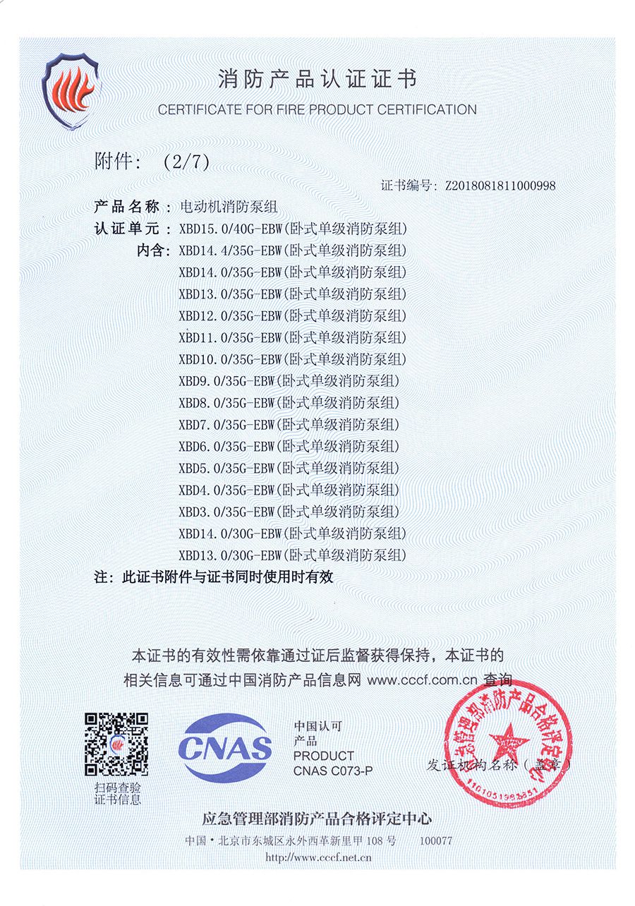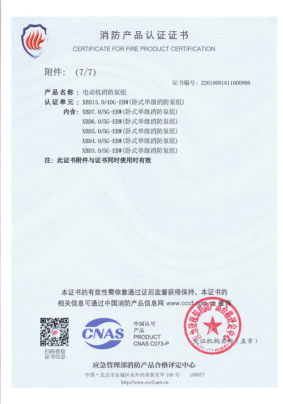 臥式單級EBW-消防產品認(rèn)證證書